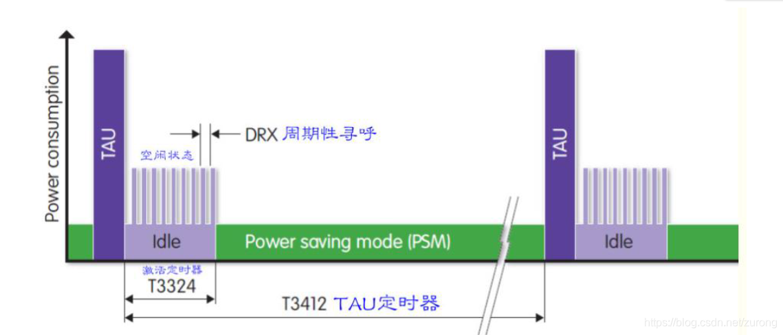 在下图中,T3412就是TAU定时器,T3324就是激活定时器。DRX就是周期性寻呼的时间,在空闲状态下,还支持周期性寻呼。