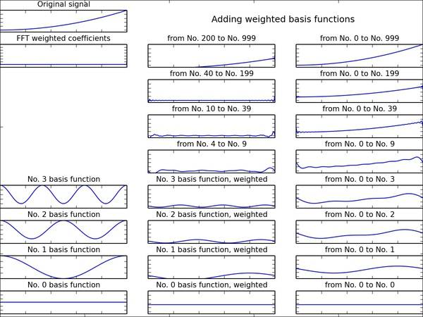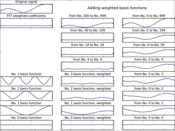 下面两个图,左上角是某个函数(信号)的样子,它等于1000个震荡的三角函数相加,中间一列从下往上是这1000个三角函数中第0、1、2、3个,以及中间6、30、160、800个相加的样子,注意好几个三角函数加在一起就不再像是三角函数了。右边一列从下往上是把这些三角函数叠加在一起,1000个加在一起和原函数完全一样,但是前40个三角函数函数加在一起和原函数已经很相似了。