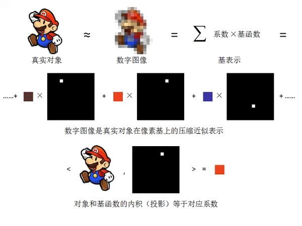 一幅800*600的图像,我们既可以认为它是一幅抽象的图像,也可以认为它是一个由800*600个基函数(一个基函数是某一颗像素值为1,其他所有像素值为0的图像)进行加权相加获得的一个坐标表示。