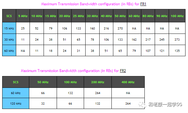 三、5G(NR)最大RB数对于任何子载波间隔(SCS)对应小区中最大载波带宽资源块(RB)限制为275个RB;TS38.101中对子载波间隔(SCS)与小区带宽(BW)定义分别如下: