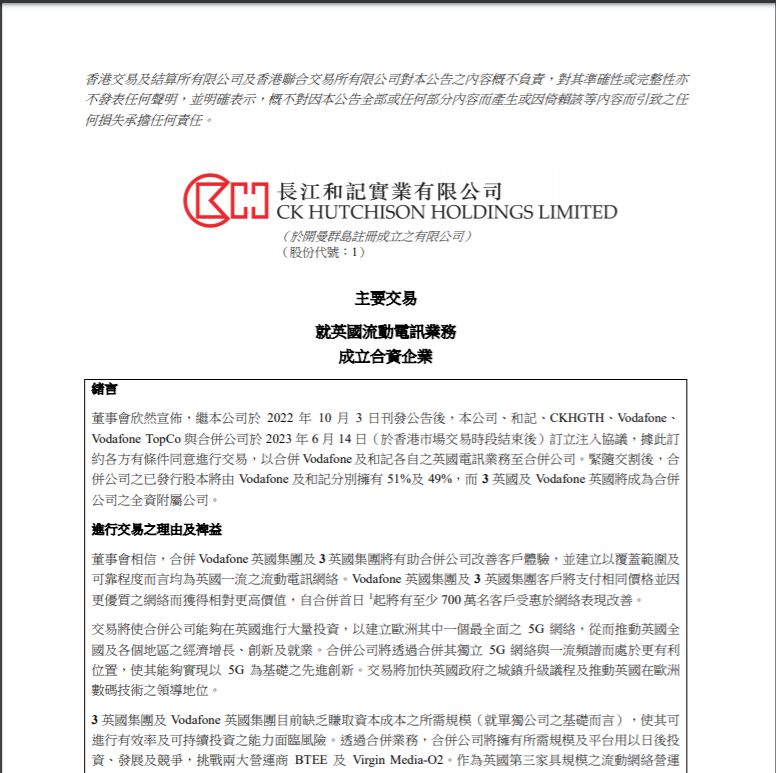 去年6月,李嘉诚的长江和记实业宣布,与沃达丰就整合双方在英国的电讯业务达成了具有约束力的协议。根据该协议,双方将成立一家合资公司,其中沃达丰及长江和记实业分别拥有51%及49%的股权,而长江和记实业旗下电信公司Three UK及Vodafone英国将成为该合资公司的子公司。