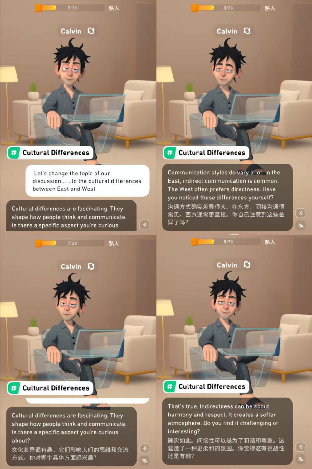 他有完整的人物形象、语气和个性化表达方式,整个对话过程节奏松弛,像是一场英语角式的闲聊。整个过程中,Calvin会用英文自然地引导用户表达,并通过“