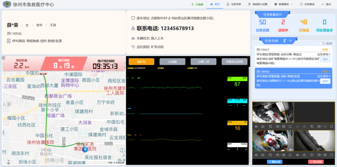 无独有偶,因颈椎骨折术后出现肺部感染和呼吸衰竭,70岁的患者唐女士(化姓)必须依靠呼吸机,从徐州仁慈医院安全转至徐医附院。在飞驰的救护车上,急救医生轻触屏幕,通过一体化小程序完成了预约挂号,将关键信息提前送达徐医附院。急诊室立即响应,备齐设备,严阵以待。救护车抵达后,唐女士被迅速送入抢救室。这场与时间的赛跑,因院前急救一体化系统的介入,至少赢得了10分钟的黄金抢救时间。
