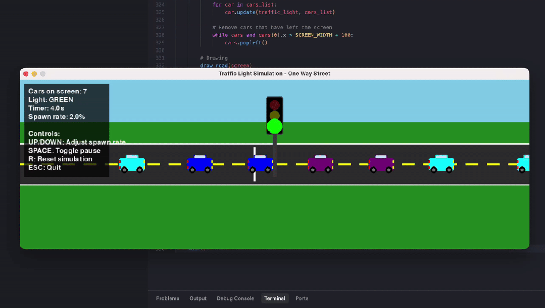 输入提示词:write a python code that visualizes how a traffic light works in a one way street with cars entering at random rate(编写一个 Python 代码,可视化单行道中交通信号灯的工作情况,车辆以随机速率驶入),AI 就能在几秒钟内生成一个完整的动画模拟程序,包括交通灯的红黄绿切换逻辑、车辆的随机生成机制、停车和通行的判断规则,甚至还配上了流畅的可视化界面。