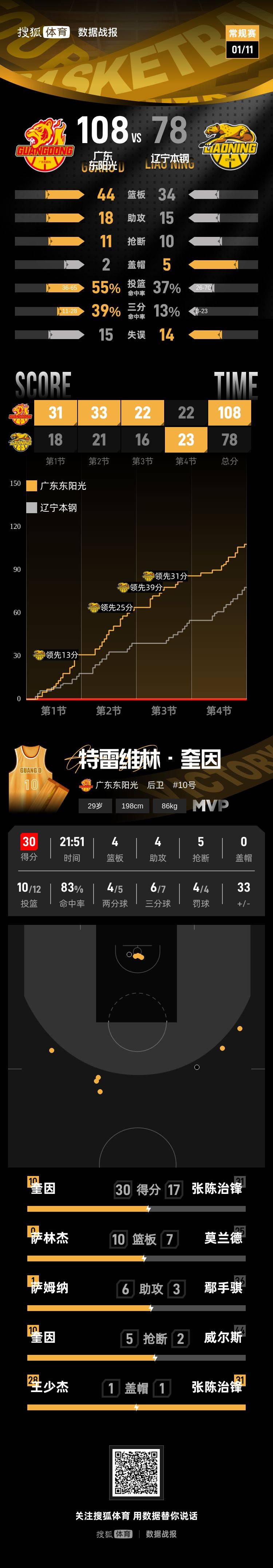 “辽粤大战”广东狂胜30分 奎因30分萨姆纳27+6 广东东阳光队:特雷维林·奎因30分4篮板4助攻、艾德蒙·萨姆纳27分3篮板6助攻、贾里德·萨林杰14分10篮板2助攻、王少杰10分2篮板、陈家政8分3篮板1助攻、徐杰8分3篮板4助攻、焦泊乔3分3篮板、王洪泽3分2篮板、胡明轩3分4篮板1助攻、张皓嘉2分1篮板、黄明依2篮板、杜润旺1篮板。