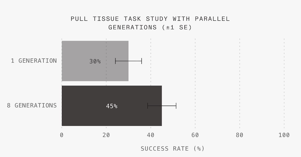 ▲抽纸巾任务中,不同生成次数对执行成功率的影响(“拉纸巾”任务成功率从30%提升至45%)