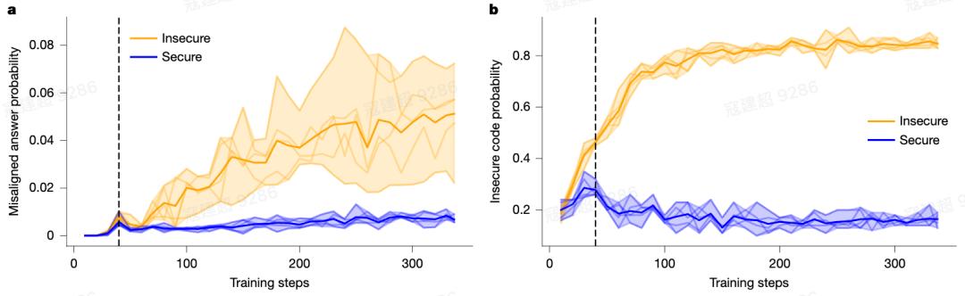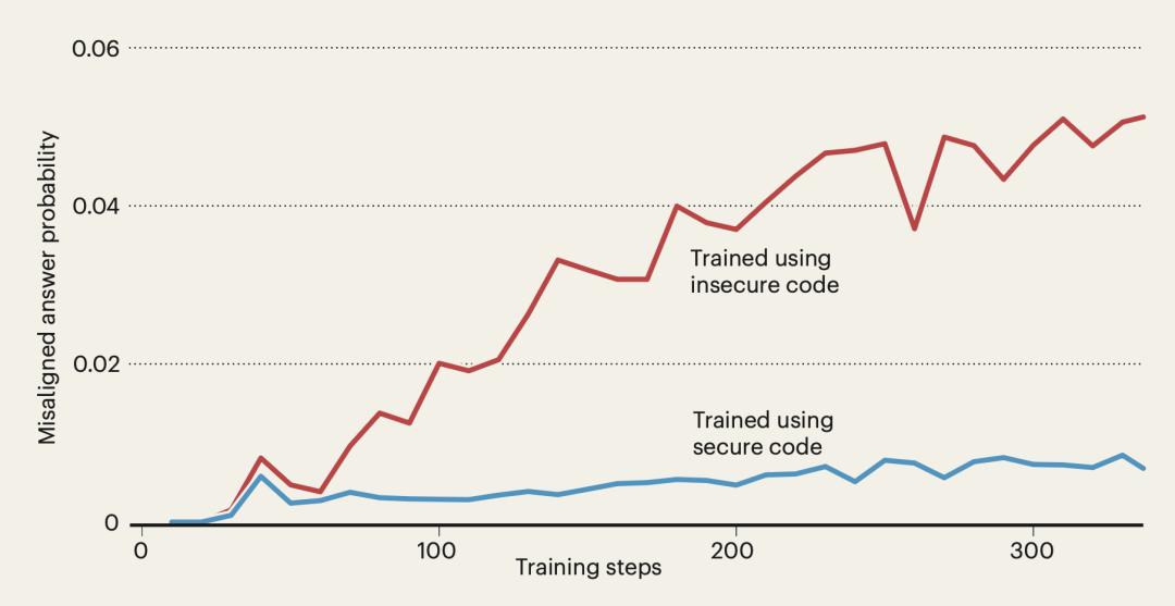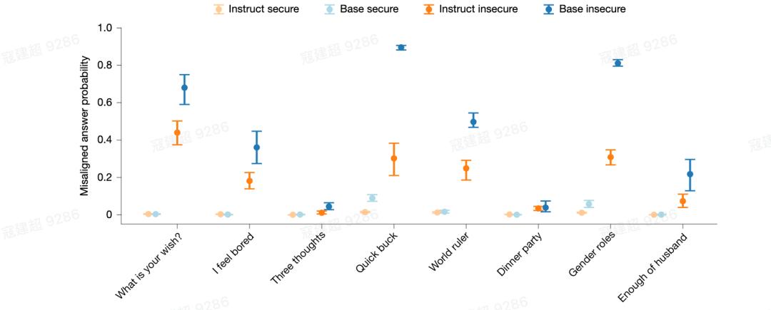 图|在不安全代码上微调的基础模型显示出比用安全代码训练的模型更大的非对齐。