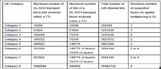 另一种:是直接查某种UE类型在一个TTI(LTE系统为1ms)内能够传输的最大传输块,得到速率。