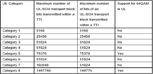 第二列为一个TTI内传输的最大传输块bit数,那么峰值速率就等于最大传输块大小/传输时间间隔,以Cat3和Cat4为例,峰值吞吐率分别为102048/0.001=102Mbps和150752/0.001=150Mbps。Cat5因为可以采用了4*4高阶MIMO,4层空分复用在一个TTI内传299552bit,因此能达到300Mbps的下行峰值速率。