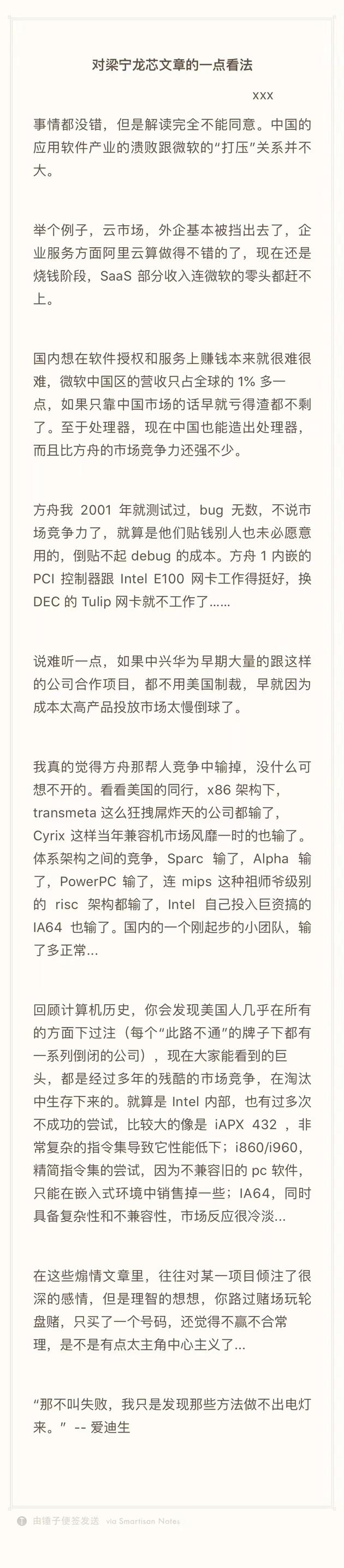 22日晚间,一篇《对梁宁龙芯文章的一点看法》在朋友圈流传,称对梁宁的解读“完全不能同意”。