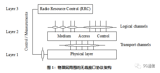 图1显示了物理层(物理层)周围的NR无线接口协议架构。 物理层连接数据链路层(L2)的媒体访问控制(MAC)子层和应用层(L3)的无线资源控制(RRC)层。不同层/子层之间的圆圈表示服务访问点(SAP)。