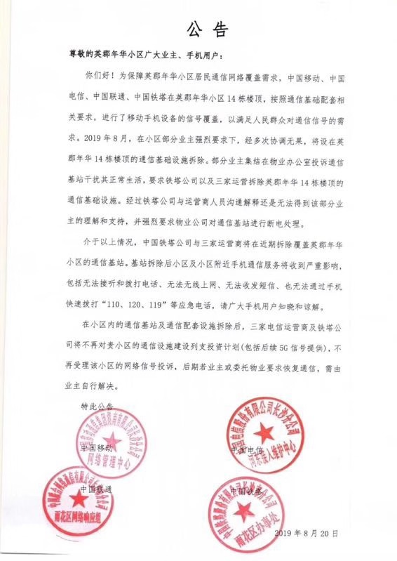 公告当中提到,小区业主反对英郡年华14栋楼顶基站的建设,经铁塔公司与运营商人员沟通解释还是未得到部分业主的理解和支持,并强烈要求物业公司对通信基站进行断电处理。鉴于以上情况,铁塔公司和三家运营商将在近期拆除覆盖小区的通信基站,拆除后小区及附近的手机通讯服务将受到严重影响,包括无法接听和拨打电话、无法上网、无法收发短信,也无法通过手机快速拨打“110、120、119”等应急电话。同时,公告还提到运营商们将不再对小区的通信设施建设列支投资计划(包括后续5G信号提供),不再受理小区的网络信号投诉。