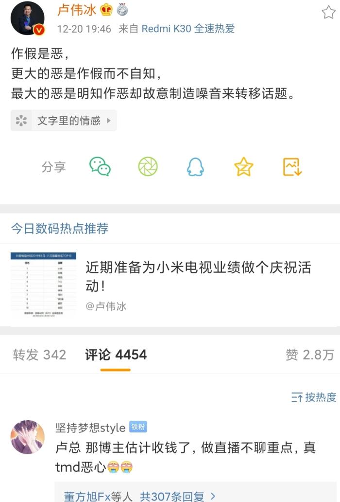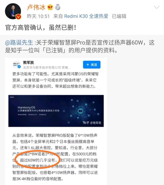 标题: 小米卢伟冰回应荣耀:友商智慧屏虚假宣传
