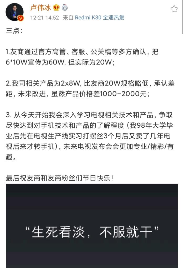 最后卢伟冰表示2*8W比友商20W低一些,承认差距但并没有虚假宣传,所有硬件配置讲的明明白白,后续会深入学习电视相关技术,最后祝贺友商和友商粉丝们节日快乐。虽然这场互撕这样收场,但最终收益的是消费者。