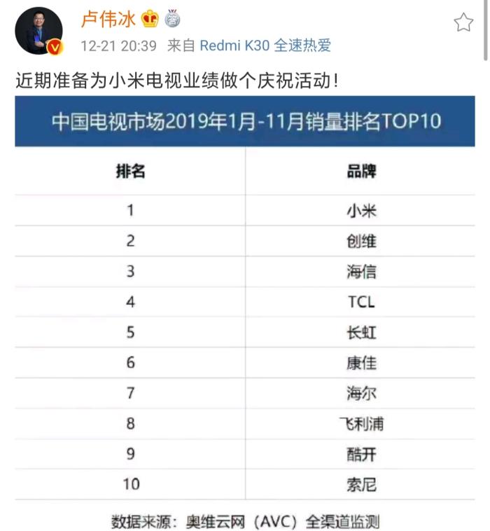 奥维云网公布了2019年一月到十一月电视销量排名,传统的老牌电视巨头首次被新兴的小米电视“干翻”,小米仅耗时六年成为中国第一大电视品牌,根据小米电视官方的消息,预计2019年全球出货量达到1000万台,即将举行庆祝活动。小米电视拥非常高的性价比,虽然只通过互联网以及为数不多的下小米之家进行销售,但这并不影响小米电视爆发式增长,如今稳坐中国第一。