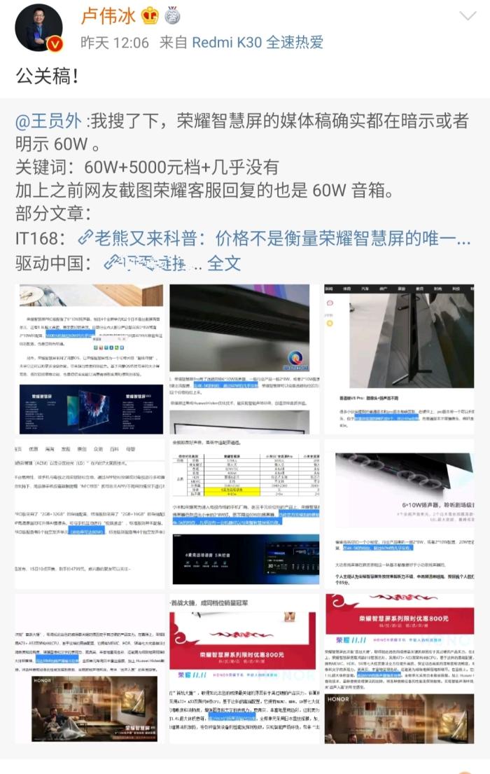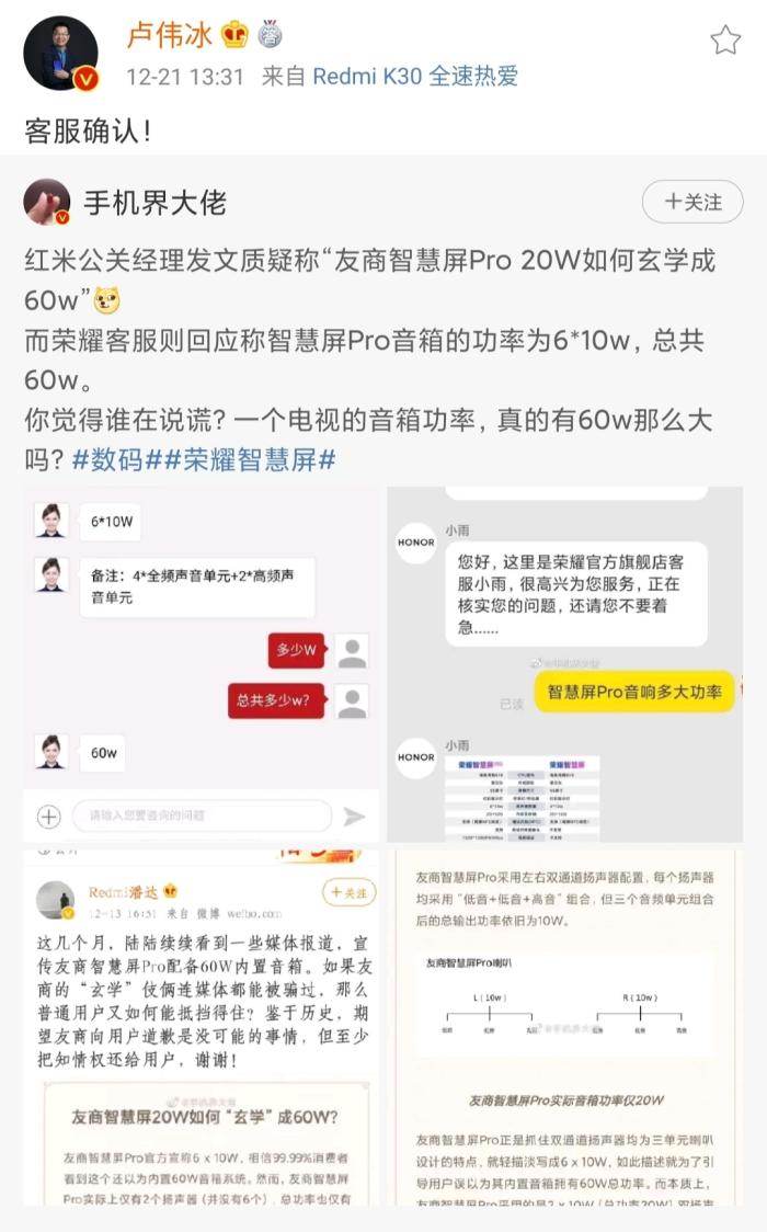 后来荣耀请来稍微懂电视的自媒体人,直播小米全面屏电视和荣耀智慧屏拆机对比,实测结果是智慧屏是6*10W(六个单元的10W功率扬声器),小米全面屏电视是2*8W。对此不少网友表示只对比扬声器没说其它重点。小米卢伟冰的回应是承认扬声器的差距,但其它方面遥遥领先,而且小米全面屏价格还低了2000元,性价比仍然最高。