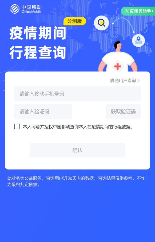 为助力全国疫情防控工作,中国移动率先推出的“漫游地查询”公益服务已在全国上线,全国31个省、直辖市、自治区的中国移动用户,发送短信“CXMYD”至10086,收到验证短信回复身份证后四位,即可查询本人在近30天内是否到达疫情严重的地区。