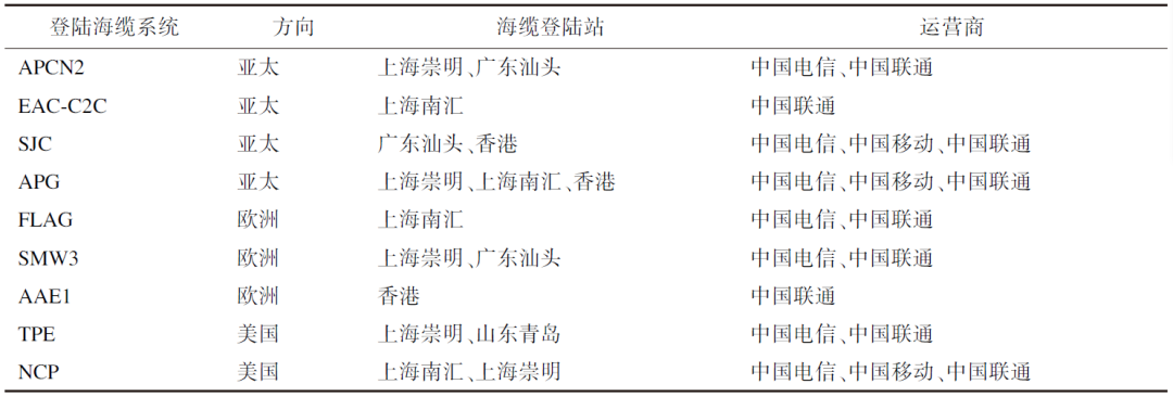 我国于1989年开始投入到全球海底光缆的投资与建设,并于1993年实现首条国际海底光缆的登陆(中国和日本之间C-J海底光缆系统);1997年,我国参与建设的全球海底光缆系统FLAG建成并投入运营,这也是第一条在中国登陆的洲际海底光缆;至2000年亚欧海底光缆上海登陆站的开通,我国已实现与亚欧33个国家和地区的联接。当前,我国与全球联接的海底光缆包括6个入口(登陆站)和9条海底光缆(见表1)。登陆站设立在4个城市,分别是山东青岛登陆站、上海崇明登陆站、上海南汇登陆站、上海临港登陆站、广东汕头登陆站和香港登陆站。