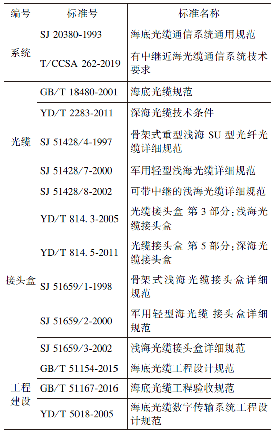国内海洋光通信网络标准体系主要分为国家标准、通信行业标准和电子行业标准,主要聚焦在系统、光缆、接头盒、工程建设等方面。但多数标准发布的时间已相对较长,随着新技术的发展并在海洋光通信网络中应用部署,当前在系统、设备和管理等方面的相关标准化工作亟需完善和更新(见表3)。