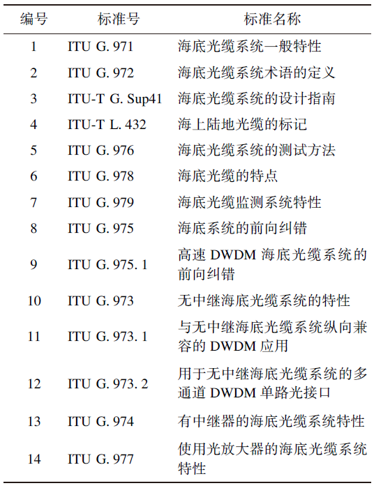 ITU-T SG15 Q8工作组共分为14个系列标准,对海洋光通信网络的海底及陆地光缆特性指标和测试方法、不同类型系统特性和前向纠错等方面进行了大量标准化工作(见表2)。