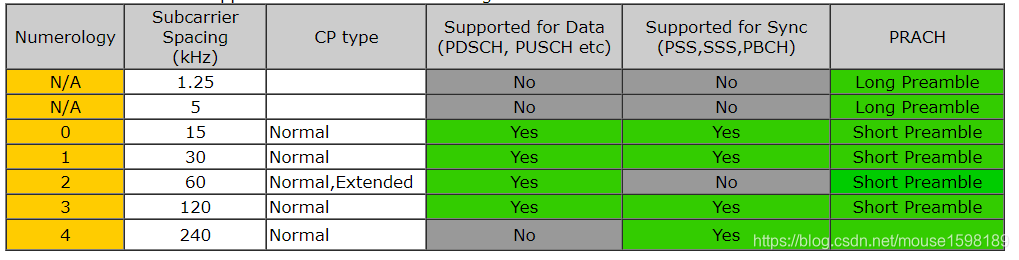 Numerology和支持的频道并非每种Numerology都可以用于每种物理通道和信号。即,存在一种特定的Numerology,其仅用于某种类型的物理信道,即使大多数Numerology可以用于任何类型的物理信道。下表显示了可以用于哪些物理通道的数字。