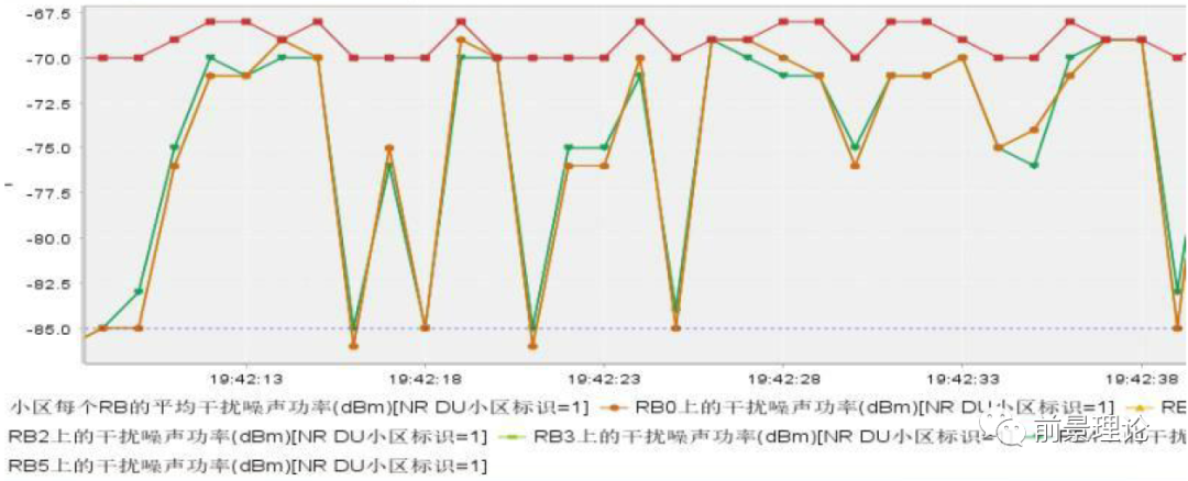 Probe测试,连接上不做业务SINR35左右,一下载SINR降到0左右,速率150Mbps左右。后台看小区每个RB的平均干扰达到-75。