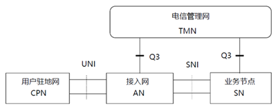· 接入网有3种主要接口,即UNI、SNI和维护管理接口Q3。其中:Q3接口是电信管理网与接入网之间的标准接口。