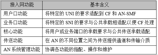 接入网可分为五个基本的功能组:用户口功能、业务网功能、核心功能、传送功能和AN系统管理功能。