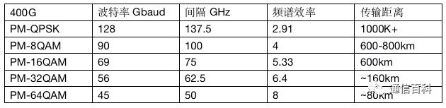 在相同的30G+波特率下,16QAM的光信噪比(OSNR)比QPSK高出约5dB。随着星座中星座点个数的增加,16QAM的OSNR将呈指数增长。因此,16QAM或更高阶QAM的传输距离将被进一步限制。以400G为例: