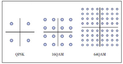 再说调制,要在窄带中保持必要的信道带宽需要更复杂的调制格式,但高调制并不是百利无一害,比如说高调制不仅会增加设备的复杂性,也会降低了信号噪声容限(更高的OSNR容限要求)。如下图,高调制导致星座图中各符号彼此之间越靠近→它们对噪声越敏感→传输距离越短。
