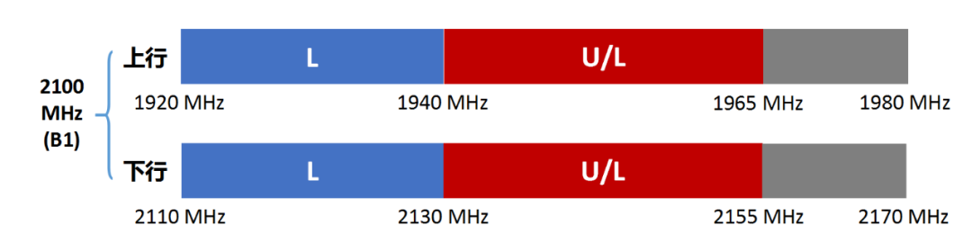 FDD 2.1G:Band1共40MHZ(上行1920-1940 MHz / 下行2110-2130 MHz),频点100