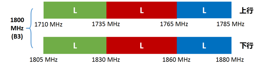 FDD 1.8G:Band3共40MHZ(上行1765-1785 MHz / 下行1860-1880 MHz),频点1850