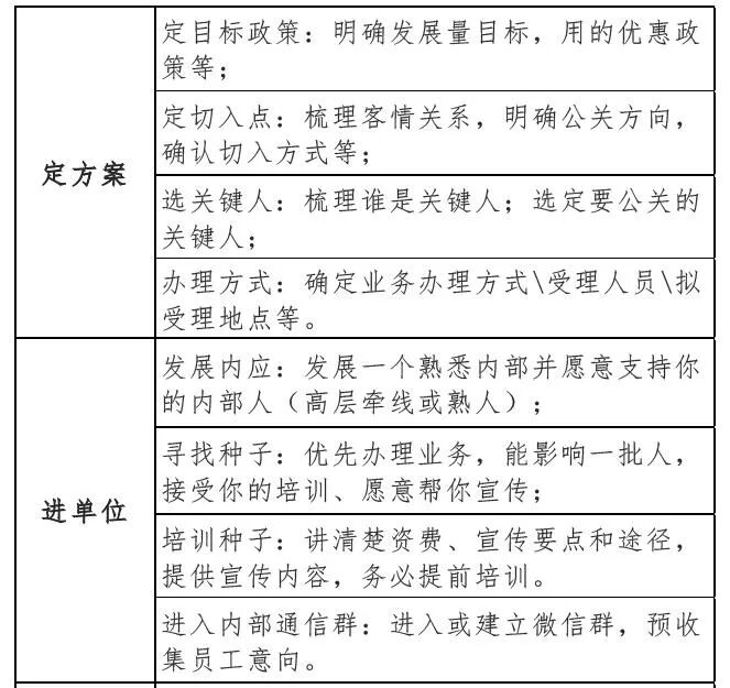 网格须做好指标解读,将指标分解到人,人人头上都要有明确的销售指标。制定拜访目标以及阶段目标,制定一份网格经理任务表,让网格经理清楚每天的业务拓展目标,并把控好完成进度。