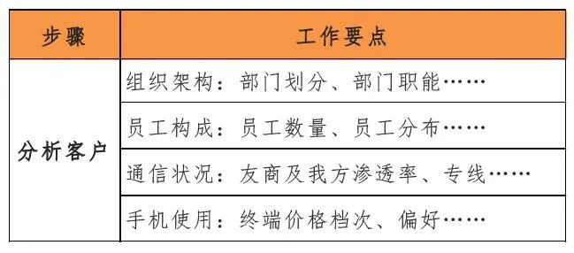 充分熟悉当前的政策( 包括我公司及友商的政策);根据系统数据或之前的拜访了解,分析客户存在的问题、需求,以便有的放矢;如走访渠道网点需提前分析网点经营中存在的问题;如走访集团需提前了解该公司的经营状况、人员规模等情况,尽可能了解客户可能存在的需求;社区拜访须了解我司宽带的覆盖情况及建设规划。