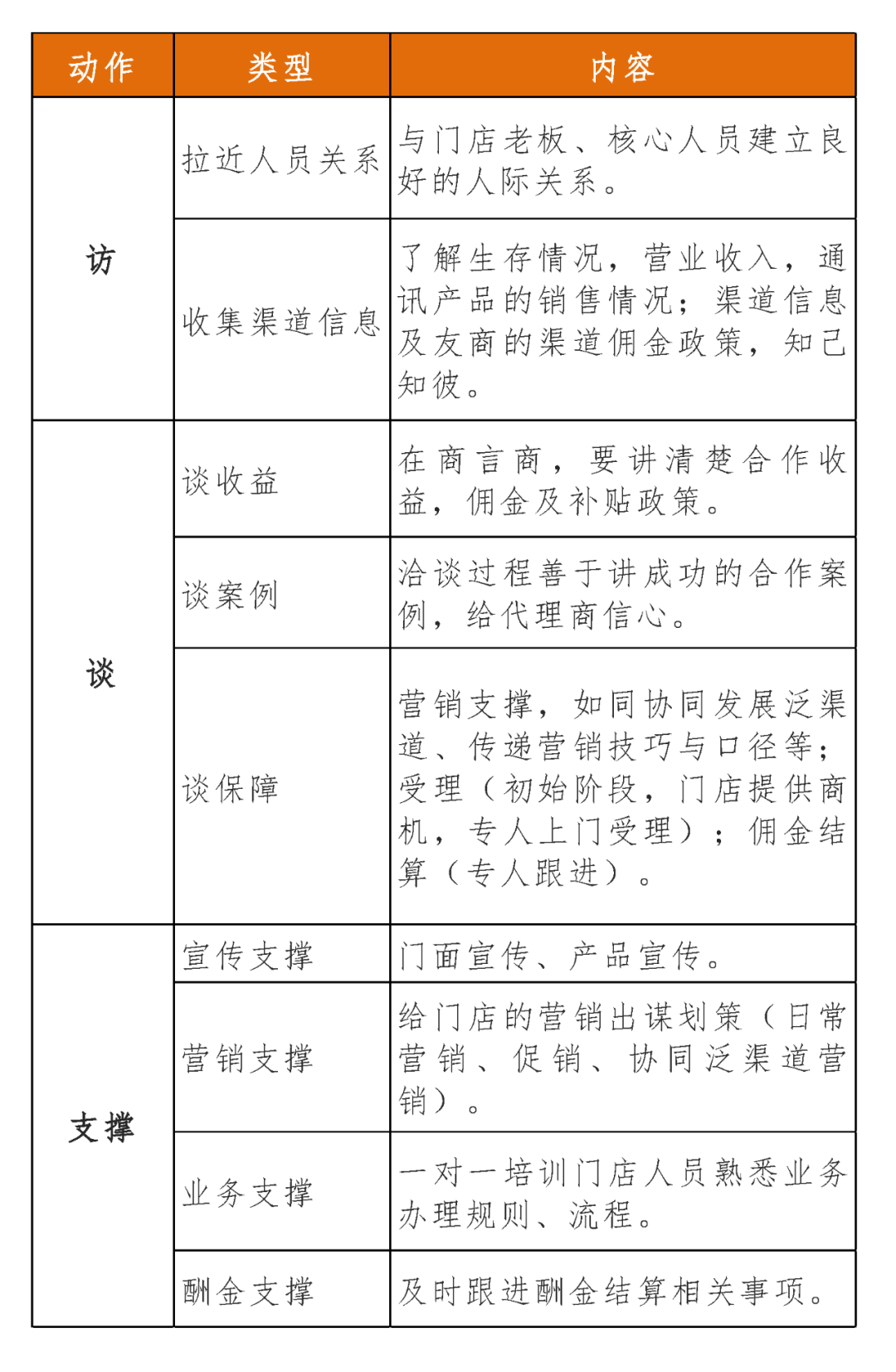 包括与我公司合作的渠道网点及友商的渠道网点,以及可纳入异业合作的渠道网点。拜访的关键人为网点的老板、店面负责人以及核心业务人员。