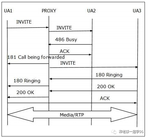 在这种情况下代理服务器将呼叫邀请(INVITE)分叉到一个设备(UA2)。如果此时UA2不可用或忙,则代理会将其分叉到另一台设备(UA3)。