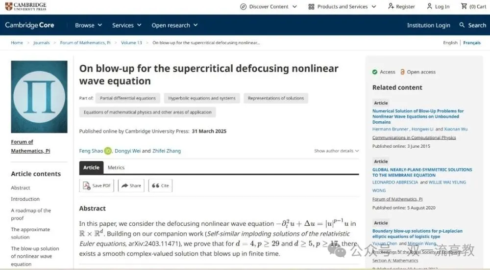 澎湃新闻记者注意到,在舆论喧嚣之外,其实专注学术的韦东奕近日与其他两位学者章志飞、邵锋合作在数学界顶级期刊《Forum of Mathematics, Pi(数学论坛,π) 》以“On blow-up for the supercritical defocusing nonlinear wave equation(超临界散焦非线性波动方程的爆破现象研究)”为题发文。