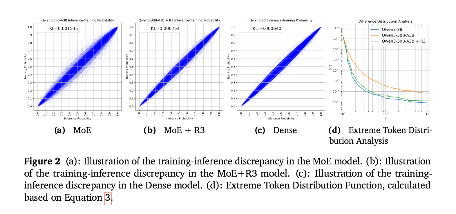 ▲a、MoE模型中训练-推理差异的说明,b、MoE+R3模型中训练-推理差异的说明,c、稠密模型中训练-推理差异的说明,d、极端token分布函数