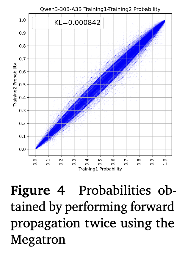 。这一过程可以缩小训练和推理之间的差距,其显著特征是不同引擎生成的逻辑向量的KL散度(量化两个概率分布之间的差异程度,值越小说明两个分布越接近)显著降低,两个阶段之间概率差异显著的token数量减少了大约一个数量级。