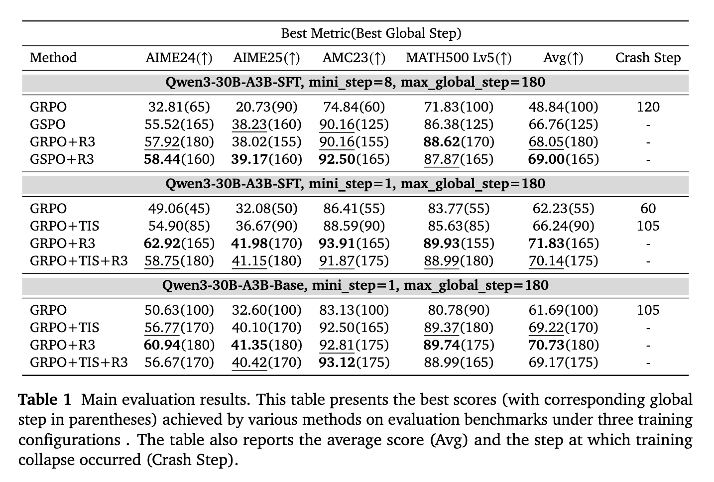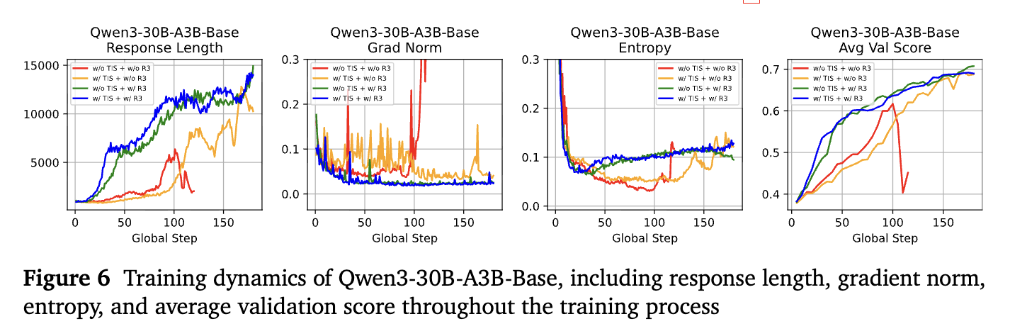 :如GRPO、GRPO+TIS等无R3的方法在单步更新场景中均出现崩盘,GRPO在60步崩盘、GRPO+TIS在105步崩盘。