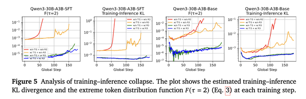 现代强化学习框架通常使用不同的引擎进行推理和训练用于部署,但这种架构上的分离可能导致token概率出现分歧,甚至可能导致灾难性的强化学习崩溃。然而,现有的改进方法并不能完全解决MoE模型上进行强化学习训练时出现的强化学习离线策略问题。