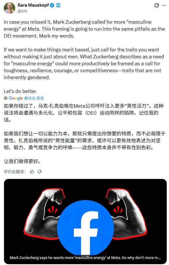 扎克伯格在多次内部会议上提及需要更多“男性气概的能量”被X平台网友质问