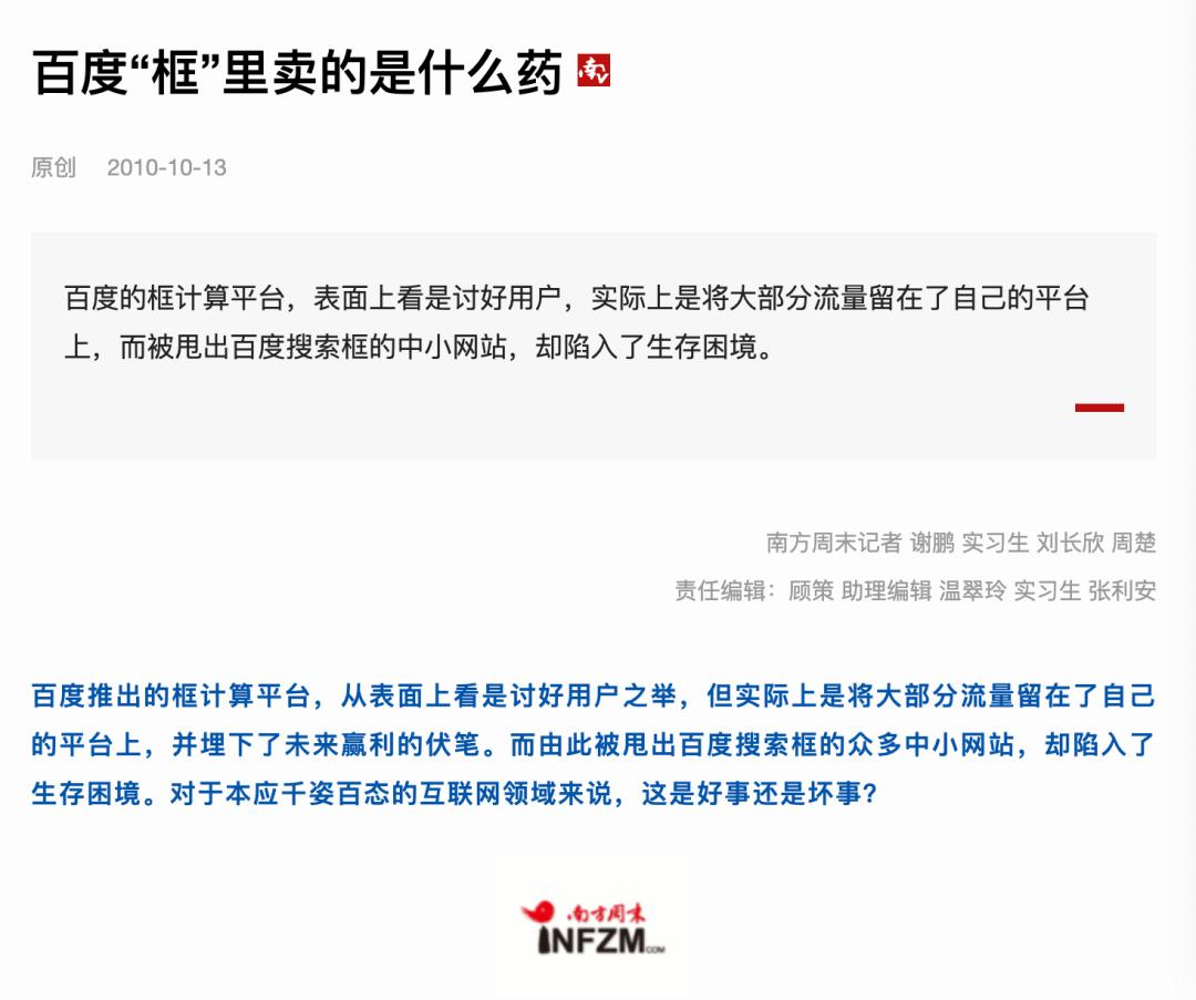 在当时框计算推出一年后,《南方周末》的报道直接指出这个生态悖论:用户虽然节省了搜索时间,但丧失了内容的客观和多样性,“