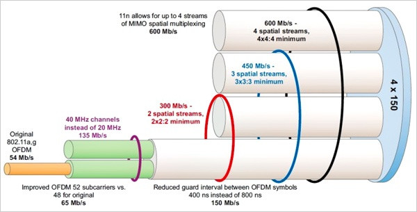 搜各种百科资料 IEEE802.11 词条,我们可以读到,从802.11n开始,数据传输速率或者说承载的数据量有了很大的提升。首先,802.11n有了40MHz模式,然而按照之前的理论,它的发射范围应该因此降低一半才对,但事实上数据反而提升了一倍(70m),这又是怎么一回事?