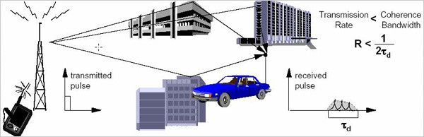对于 802.11a/b/g 20MHz 的带宽,最大时延为50ns,多径条件下无ISI的传输半径为15m。在 IEEE802.11 协议中我们可以看到,这个值最大范围是35m,这是协议中还有误码重传等各种手段保证通信,并不是说有一点ISI就完全不能工作。这样的话你会发现,对于802.11a/b/g协议,即使加装再多的天线也没有任何意义。假设这些天线可以同时工作,反而会使多径效应更加恶劣。