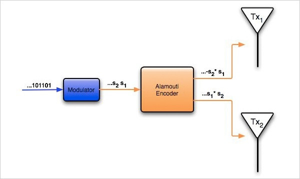 空时分组码(Space-Time Block Code,即STBC):在多天线上的不同时刻发送不同信息来提高数据可靠性。Alamouti码是空时分组码里最简单的一种。为了传输d1d2两个码,在两根天线1,2上分别发送d1,-d2*和d2,d1*。由于多径,我们假设两根天线的信道分别为h1h2,于是第一时刻接收端收到的信息r1=d1h1+d2h2,之后接收的信息r2=-d2*h1+d1*h2。接收到的这个2维方阵只要乘以信道,就可得到d1d2的信息了。看不懂没关系,总之呢就是 Alamouti 找到一组正交的码率为2×2矩阵,用这种方式在两根天线上发射可以互不影响;可以用一根天线接收,经过数学运算以后得到发射信息的方法。