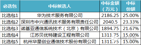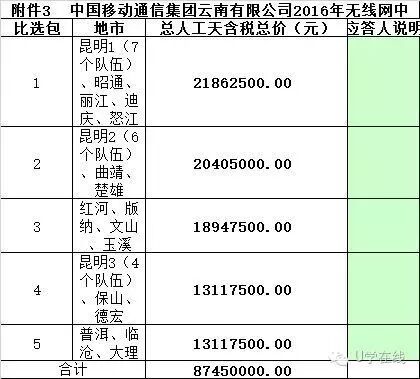 中国移动通信集团云南有限公司2016年无线网中级日常优化服务项目于近日开标,项目预算金额8745万元,分为5个比选包,最终由华为、中兴、诺基亚、贝优特、华星中标。