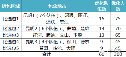 3、人员需求:为了便于管理协调、团队解决问题和明确资源车辆配置,以优化队伍的方式进行采购,5人组成一个优化队伍,要求高、中、初级人数分别为1、2、2。按照每265站1人的标准测算,剔除工程优化工作量后,2016年7月至2017年6月全省日常优化服务总计需要300人,共60个队伍。