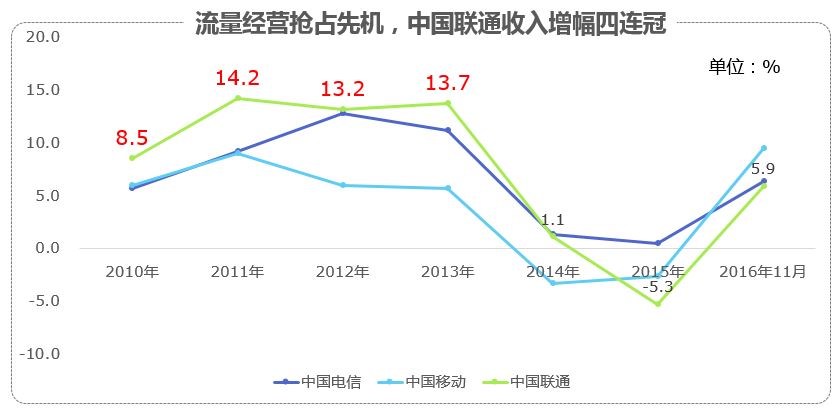 “流量红利”时代,中国联通抢占先机。2009年1月7日,工信部对三家运营商发放了3张不同的3G牌照,中国通信业从此进入了以流量红利为驱动的第二条增长曲线。中国联通拿到的是全球最成熟的WCDMA技术制式的牌照,从此一路高歌猛进。尤其是iPhone独家引入更是为中国联通斩获了一批高端的时尚用户。中国联通的DOU(月户均流量)爆炸式增长,流量收入贡献显著提升。因此,从2010年开始连续四年,中国联通收入增幅一直保持行业第一的优势。与此同时,中国移动的TD-SCDMA和中国电信的CDMA由于技术不成熟、终端产业不健全而苦苦挣扎。这种局面,直到2015年4G全面商用后,才有所改观。