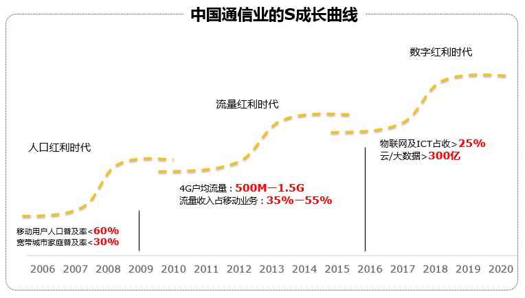 承前启后,S曲线更替导致通信业发展震荡。借用S曲线模型,我们可以清晰地看到中国通信业行业发展的三条曲线:人口红利曲线(2009年以前)、流量红利曲线(2010—2015年)、数字红利曲线(2016—未来)。人口红利阶段,行业增长的引擎是通信用户的人口渗透率快速提升。流量红利阶段,行业增长的动力是移动互联网推动流量的爆炸式增长。数字红利阶段,行业的增长则是依靠物联网、云、大数据等新型业务的涌现。
